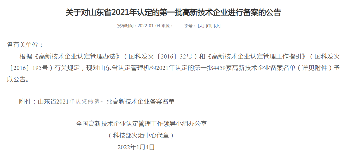 近日,山東省高企業(yè)認(rèn)定管理工作網(wǎng)公布了《關(guān)于對山東省2021年認(rèn)定的diyi批企業(yè)進(jìn)行備案公示的通知》,